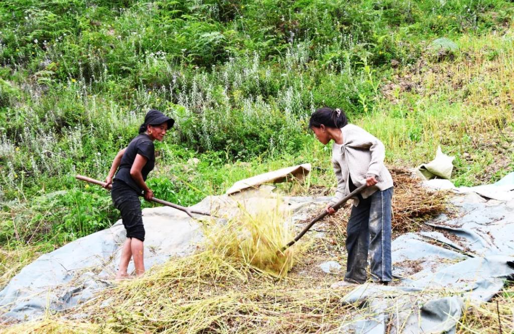 大哥名叫洛比吉莫,当天凌晨3点,他们一家三口便带着干粮来到田里,开始割荞。原来,收荞的时间是非常讲究的,割荞必须在上午10点前完成,而打荞则要在10点以后,让太阳把荞堆晒干,打起来省力。“今年我们家种了5亩苦荞,留足家里吃的,剩下的都能卖到苦荞加工厂。”洛比吉莫一边擦拭着汗水一边说道。